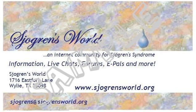 Pooh, I have just completed printing out 20 business cards and I feel so blessed just to be able to hand these out to my friends, family, dentist and rheumy that I would love to make a donation to Sjogren's World. This is such a huge service for us and will be such a help for everyone who has people who do not understand what we have to deal with!